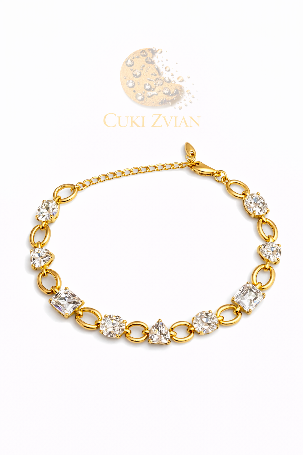 La pulsera Cuki Zvian es una pieza sofisticada diseñada para realzar la elegancia natural de quien la lleva. Su diseño combina delicados eslabones dorados con cristales de cortes variados que reflejan la luz con un brillo excepcional, creando un equilibrio perfecto entre lujo moderno y distinción atemporal.